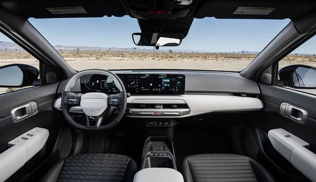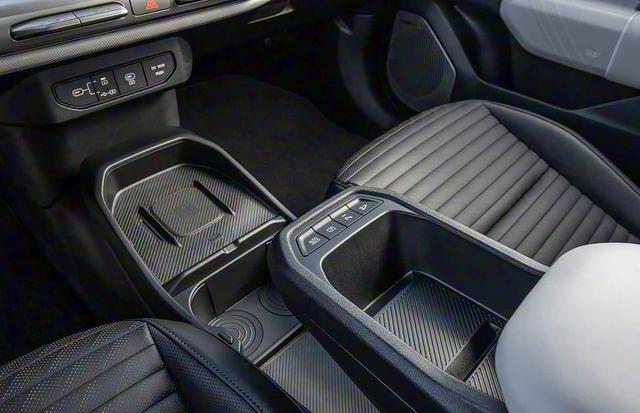 内饰部分,中控台造型简约立体,中控面板有着不错的层次感,使用了悬浮式的双联屏,双色的三幅式方向盘有着不错的精致感,换挡为怀挡式。前排扶手前部使用了悬挑式的储物格,前部还带有一组实体按键。中央地台区域的前部是手机无线充电板,后部则是大面积的储物格。